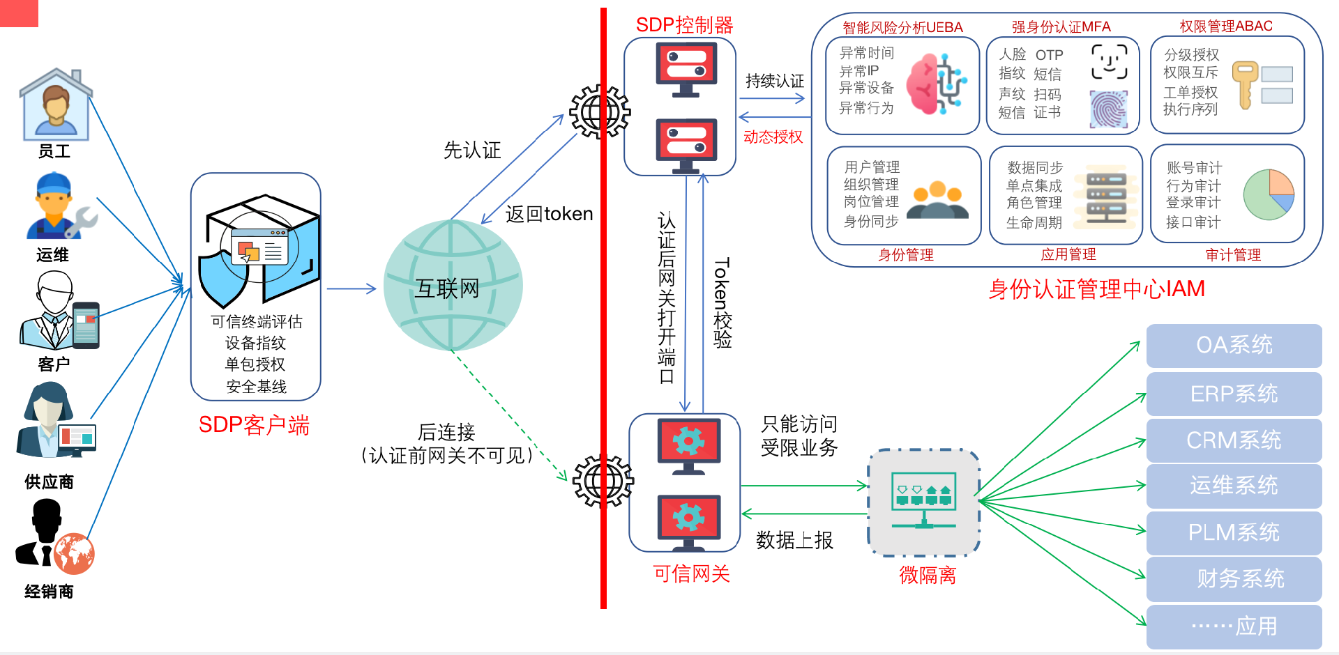 零信任安全防护体系,指的是默认不信任网络中任何身份、任何访问行为作为基础,基于身份(人员、设备、网络、行为)为中心,动态、按需开放身份权限内的资源,并在访问过程中随时检测随时鉴别,访问结束后马上关闭所有权限。默认状态下实现资源网络隐身,防止资源暴露,保障资源只提供给合法访问者在合法行为下访问或使用。
